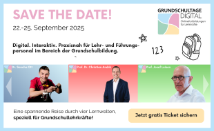 Grundschultage Digital – Fortbildung, die inspiriert! Tauchen Sie ein in neue Ideen für die Grundschule: Zwischen 14:00 und 20:15 Uhr starten im Stundentakt spannende Webinare rund um den Unterricht. Jede 60-minütige Session beleuchtet ein anderes Thema – praxisnah, vielseitig und ganz auf den Grundschulalltag ..